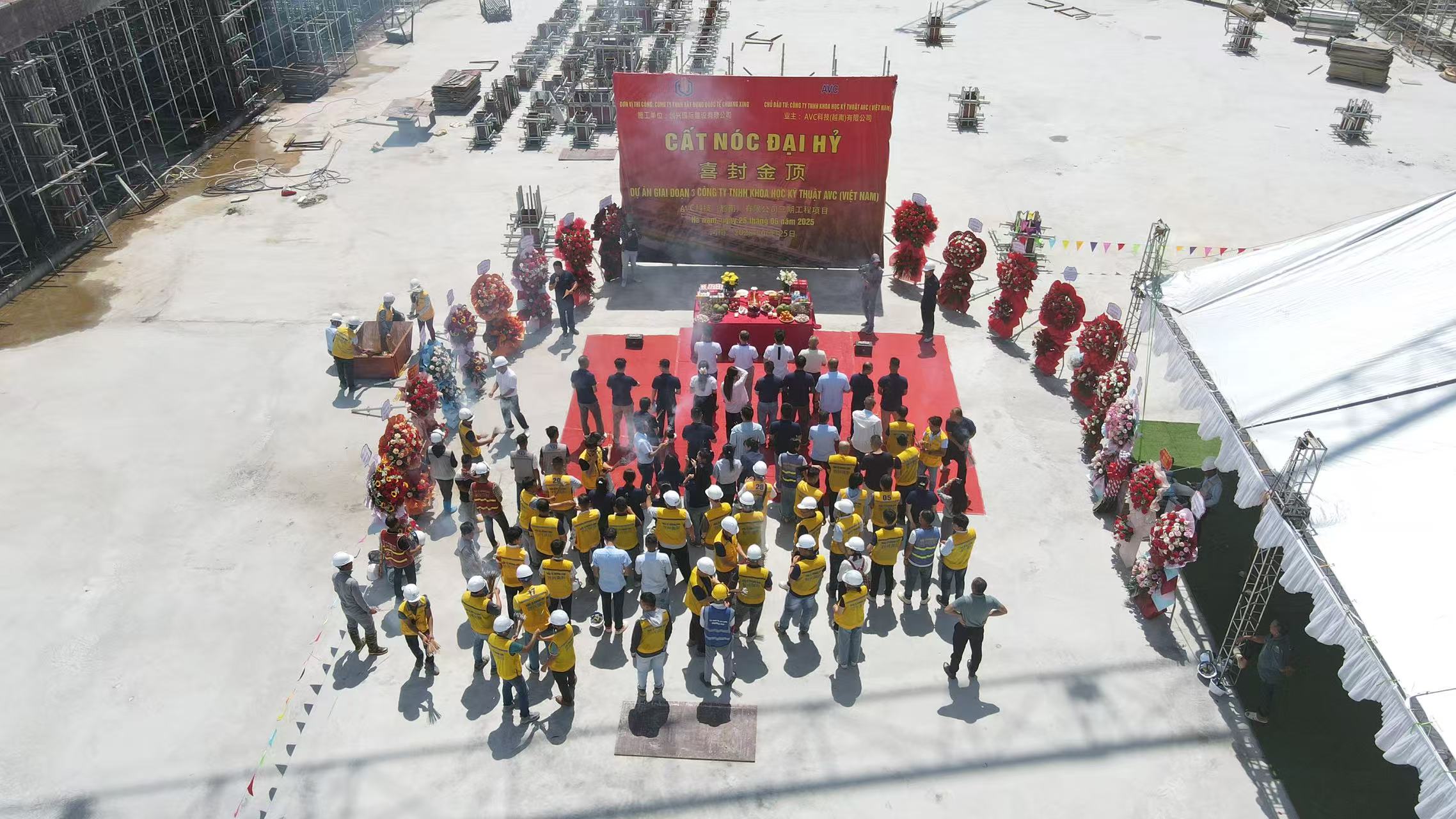 2025年6月25日(農(nóng)歷六月初一)上午,AVC科技(越南)有限公司三期土建工程項目榮耀封頂!在聲聲喜慶的禮炮聲和掌聲中,封頂儀式圓滿成功!